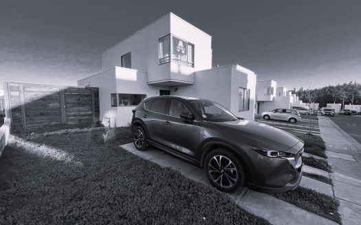 Propiedad esquina con antejardín y espacio para estacionamiento.